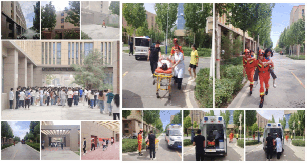 演练前,消防员对学校的建筑结构、消防设施、功能分区、重点部位等进行了了解和掌握。灾情设置为:数信楼B403教室(机房)电器故障发生火灾,学院实验室工作人员积极采取自救措施,并拨打119电话报警,但因火势蔓延扩大,失去控制,造成楼内仍有多名人员被困未及时疏散,情况紧急。喀什支队指挥中心接到报警后,消防人员紧急出动到场处置,同时协调校医院、消防控制中心、微型消防站、学校师生等社会联动力量共计230余人参与此次演练。演练中,根据现场情况下达作战命令,从火情侦查、人员搜救、堵截火势等方面开展演练。
