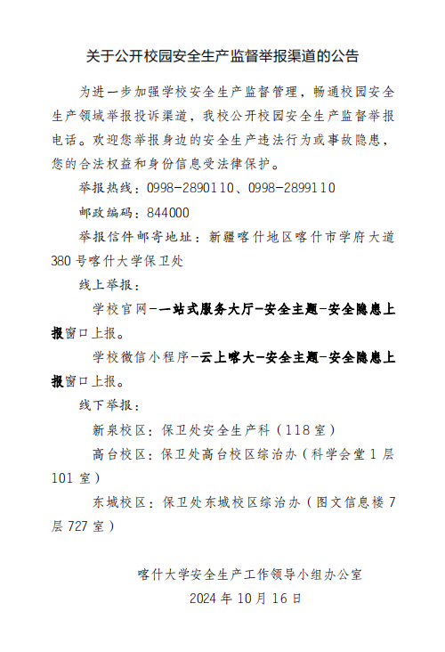 举报信件邮寄地址:新疆喀什地区喀什市学府大道380号喀什大学保卫处