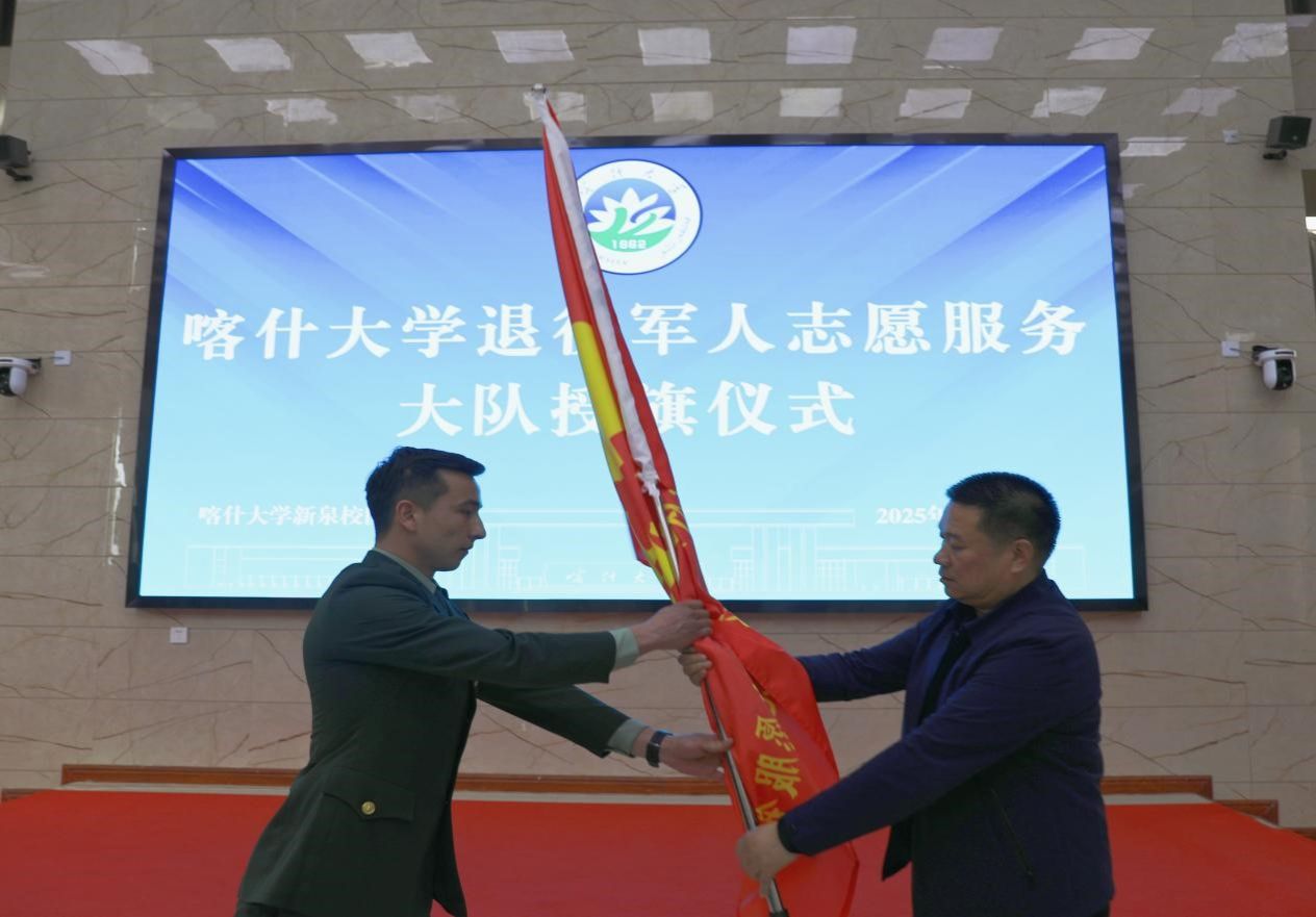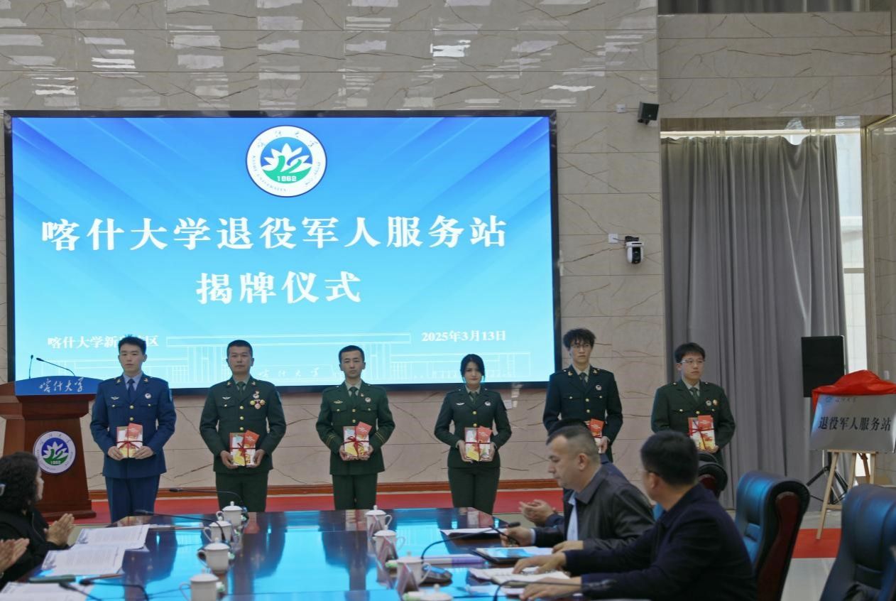 揭牌仪式上,喀什地区退役军人事务局与喀什大学共同为服务站揭牌,并为喀什大学退役军人志愿服务队授旗,向退役大学生代表赠送政策“大礼包”。